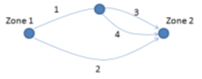 Problem 5. Consider the 2 zone system shown below, with a 4 link road network. 7000 vehicles are travelling from Zone 1 to Zone 2 in the am peak hour. The peak hour volume delay function for each link uses the BPR formula as follows: \[f(V_l)=L/S(1+(v/c)^b)\]