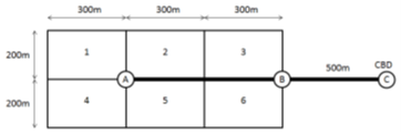 Problem 7. A neighborhood with Manhattan grid road network consists of six traffic analysis zones. The population for each zone is given in Table 3. Average walking speed of people living in the neighborhood is \(1.5m/s^2\). An LRT line connects the neighborhood to the central business district (CBD). The rail line has a frequency of 5 trains per hour and has two stations in the neighborhood, as shown below. The LRT vehicle has an acceleration rate of \(1.3m/s^2\) and a deceleration rate of \(1.3m/s^2\), and a maximum speed of 40 km/hr. Consider that the trip origins and destinations uniformly distributed throughout each zone.