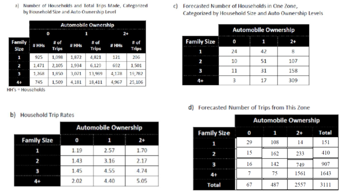 • Trips generated by a zone = \(\sum_k A_k \times HH With Cars \text{ where k} = 0, 1, 2, 3, etc.\)