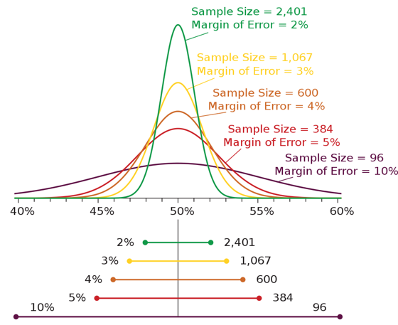 \[n = \frac{z_{\alpha/2}^2 S^2}{e^2+\frac{z_{\alpha/2}^2 S^2}{N}}\] - where - \(𝑧\) is a z-statistic - \(𝑆^2\) is the sample variance (generally unknown) - \(𝑒\) is the desired margin of error - \(𝑁\) is the population - If \(𝑛_0=\left(\frac{𝑧_{\alpha∕2}^2 𝑆}{e}\right)^2>𝑁\) then simply take a census of \(n=N\) or use \(𝑛=𝑛_0/(1+𝑛_𝑜/𝑁)\) - For large populations (\(n \approx n_0\)), need approximately same sample size regardless of if the population is 10 million or 1 billion - Approximation of 𝑆^2 1. Use sample quantities from pretesting of survey 2. Use previous studies or data available from literature 3. If all else fails… guess the variance based on some hypothesized distribution for the data! If you assume a normal distribution, could approximate variance as feasible range of values divided by 4 (within 2 SD of mean) or 6 (within 3 SD of mean).